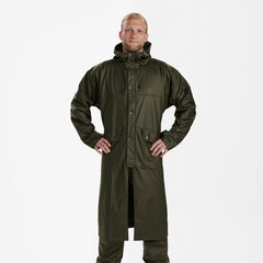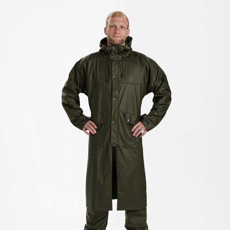 Deerhunter Hurricane Long Raincoat is the perfect companion for all your outdoor activities in rainy weather. This full-length coat with hood features a 100% waterproof PU coating that protects you even during heavy downpours.